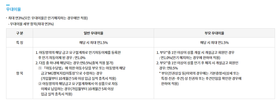 우대금리는 크게 보면 일반 우대금리와 부모 우대금리, 이렇게 두 가지로 구성되어 있습니다. 아동 명의의 요구불 계좌로 만기 자동이체를 신청하거나, 아동수당을 새마을금고 계좌로 수령하는 등의 조건을 만족하면 최대 연 1.5%의 일반 우대금리를 제공받게 됩니다.