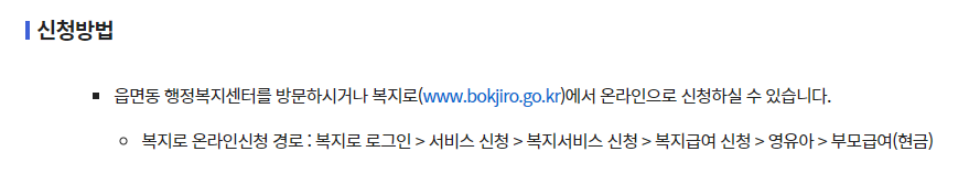 | 신청 방법 | - 출생 신고와 함께 신청 가능 - 출생일로부터 60일 이내 주민센터 방문 또는 온라인으로 신청 - 60일 이후 신청 시 소급 적용 불가 |
