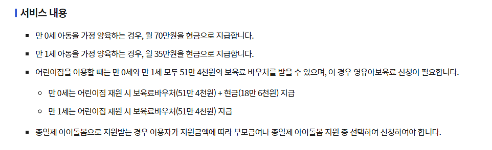 | 지원 금액 | - 만 0세: 월 100만원 - 만 1세: 월 50만원 - 어린이집 이용 시 보육료 공제 후 차액 지급 |