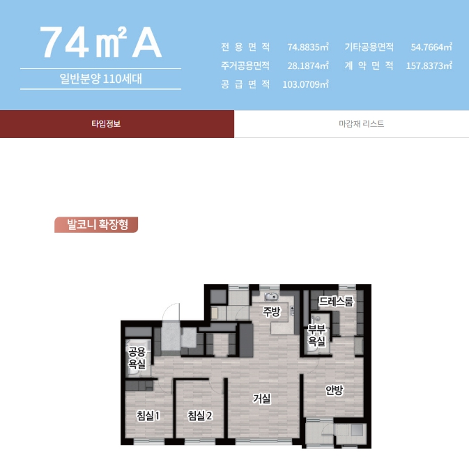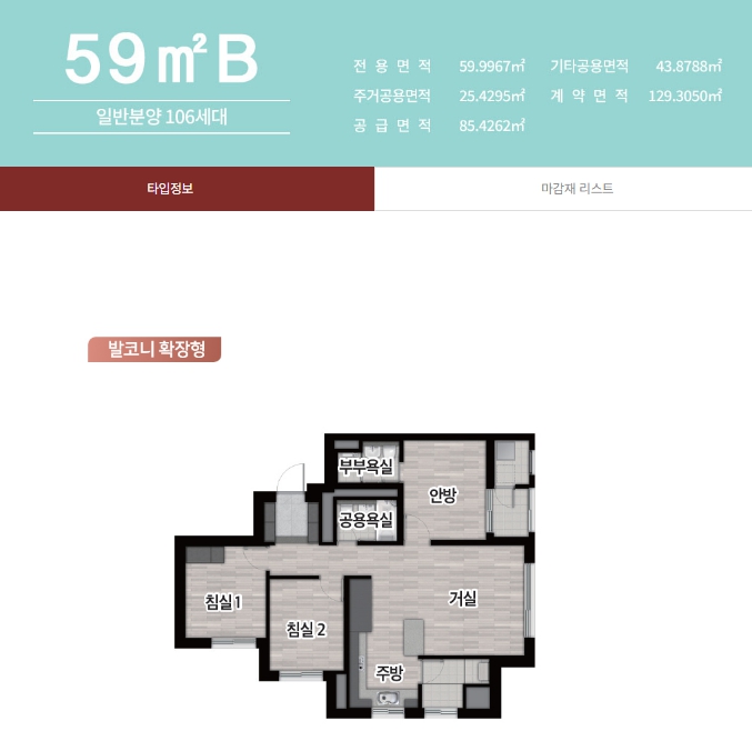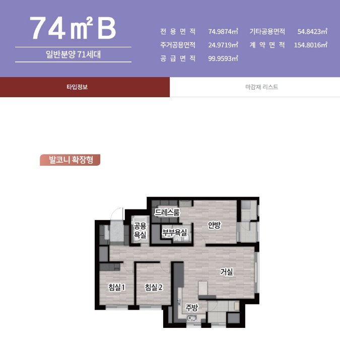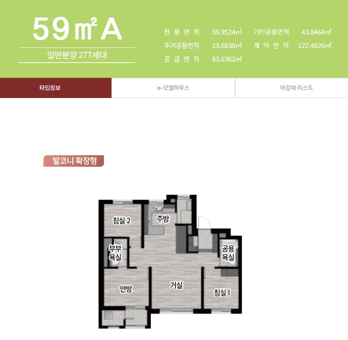 이 아파트는 전용면적 59㎡, 74㎡, 84㎡ 등의 다양한 평형으로 구성되어 있으며, 각 타입별 특징은 다음과 같습니다.