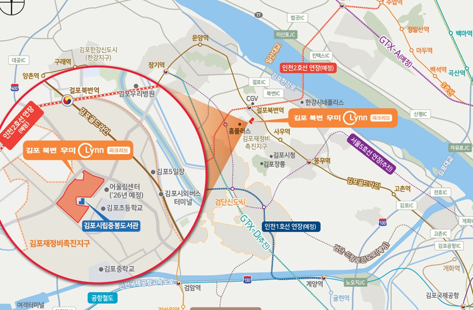김포 북변 우미 린 파크리브는 탁월한 교통 환경을 자랑합니다. 단지 가까이에 김포골드라인 걸포북변역이 자리하고 있어 역세권 입지의 이점을 누릴 수 있습니다. 걸포북변역은 추후 인천2호선 고양 연장선(예정)이 정차할 계획이어서 향후 서울로의 접근성이 더욱 좋아질 전망입니다.