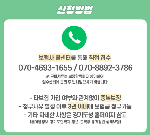 보험금 청구에 필요한 구비서류는 보장항목별로 다르므로, 사고 발생 시 먼저 접수센터에 문의하여 정확한 안내를 받아야 합니다. 이외에 더 자세한 사항은 경기도 청년기회과(031-8008-3473)에서 상담받을 수 있습니다.