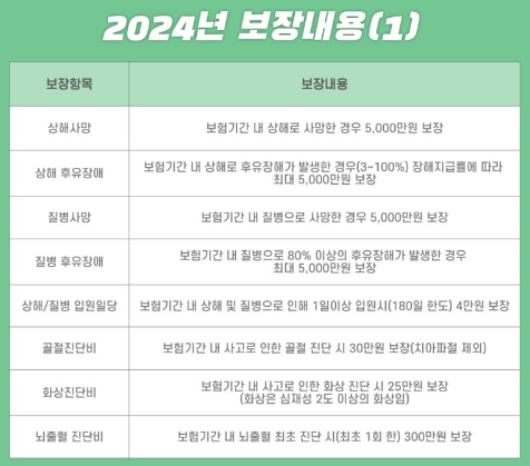 - 내용: 사망, 상해·질병 후유장해 등 보험사고 발생 시 보험금 지원 (별도 가입절차 없이 자동가입)